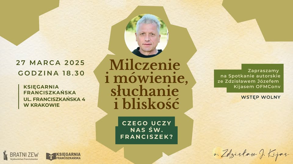 Zapraszamy na spotkanie autorskie ze Zdzisławem Kijasem OFMConv, autorem książek: „Greccio i owoce nocy ciemnej św. Franciszka”, „Stygmaty św. Franciszka i odrodzenie człowieka”, „Reguła i życie. Czego dziś uczy św. Franciszek” i „Kto słucha Boga. Napomnienia św. Franciszka” wchodzących w skład serii „Inspiracje franciszkańskie”.